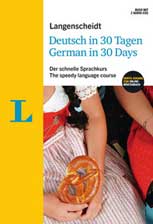 Der vorliegende Sprachkurs mit der Erklärsprache Englisch richtet sich an Adressaten, die schnell die deutsche Sprache bis zur Niveaustufe A2 erlernen wollen. Das soll in 30 Tagen, den 30 Lektionen entsprechend, geschehen. Erreicht werden sollte dieses Ziel u.a. auch mit einer Fortsetzungsgeschichte, mit Themen aus dem Alltag, von Reisen und aus dem Beruf. Hinzukommen Dialoge in zwei Sprechgeschwindigkeiten, die von Muttersprachlern gesprochen werden. Nach jedem Tag, sprich Lektion gibt es eine Selbsteinschätzung, weiterhin werden in Wiederholungseinheiten Zwischen- und Abschlusstests vorbereitet. Interessant sind auch die angebotenen Lernstrategien, die praktischen Kulturtipps und der für ein Jahr kostenlose Zugang zum online- Langenscheidt-Wörterbuch.